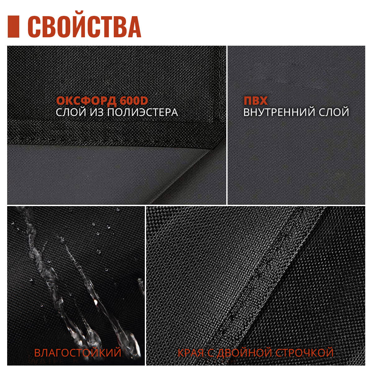 - Надёжная ткань. Чехол сделан из полиэстеровой ткани 600D с пропиткой ПВХ, водооталкивающим слоем. Чехлы Z Grills устойчивы к протиранию, царапинам, выцветанию, влаге.