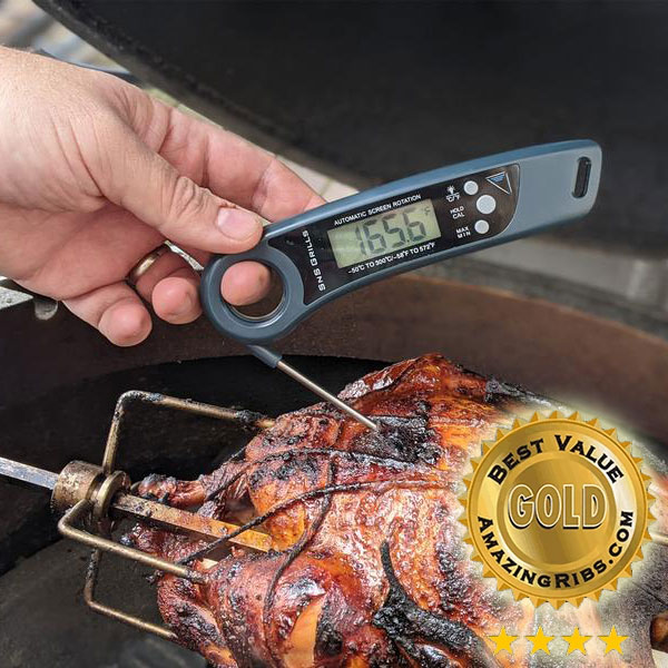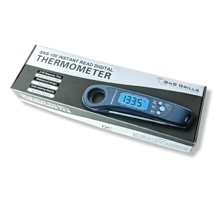 Термометр для мяса, разработанный на основе идеи директора SnS Grills Дэвида Пэриша и лично им протестированный. Быстро считывает температуру блюда, оснащён ярким дисплеем, защищён от влаги, очень точный, со встроенной функцией калибровки. Надёжный и удобный помощник для любого гриль-мастера от Slow ‘N Sear.