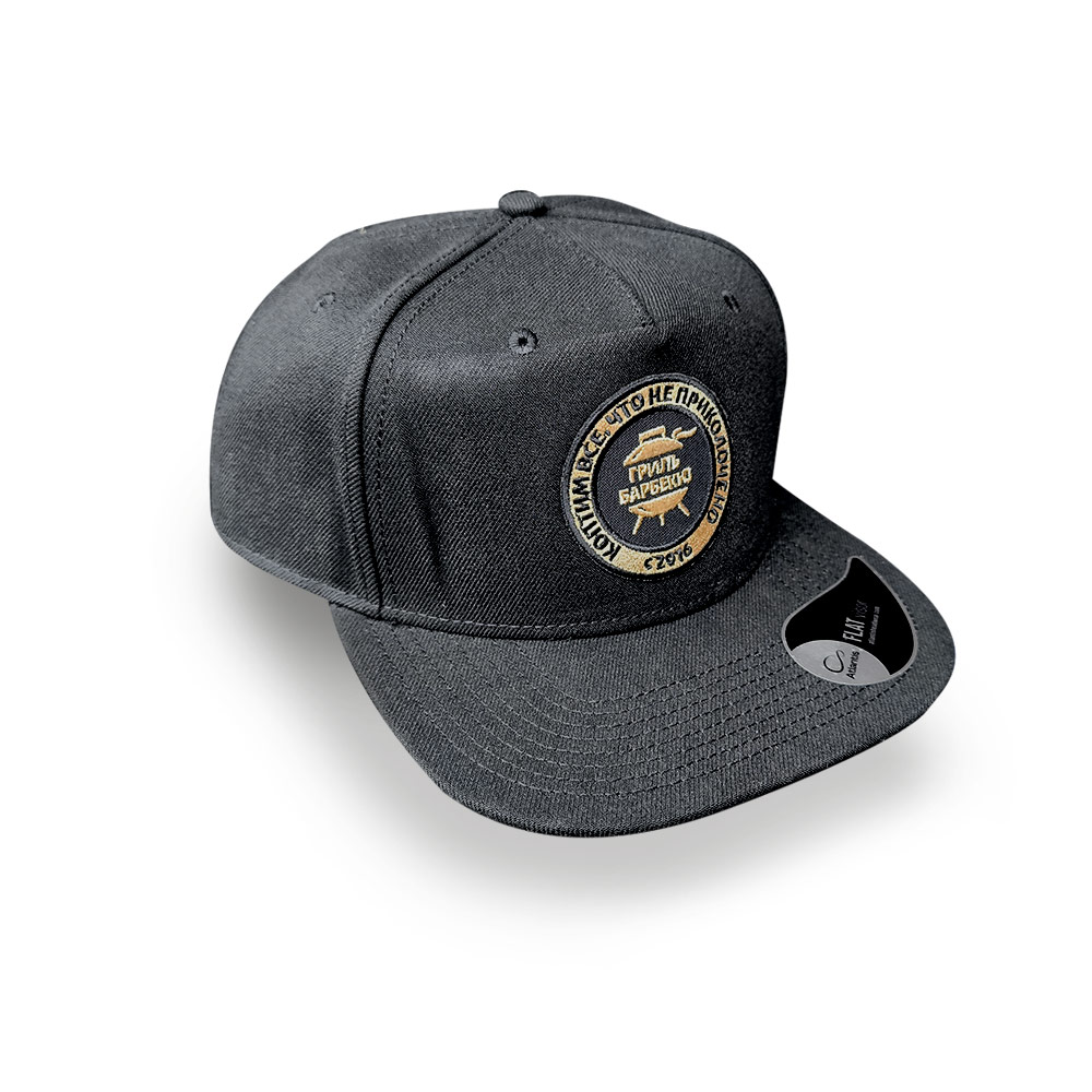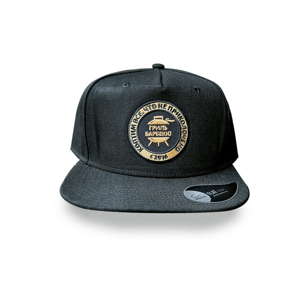 Кепка с золотым шевроном «Коптим всё, что не приколочено» и лого «Гриль-Барбекю Клуба». Прямой козырёк, пластиковая застёжка, универсальный размер.