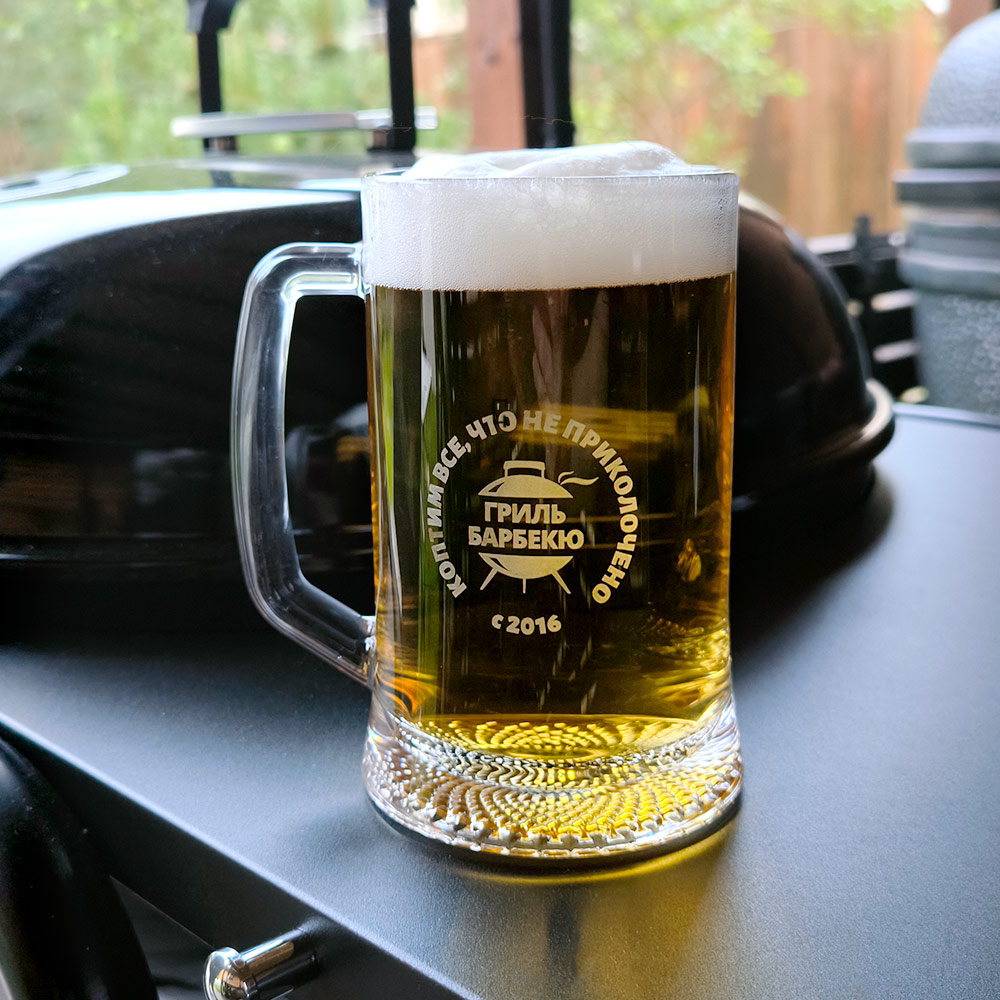 Удобная большая кружка для пенного, с гравировкой логотипа. Потому что «какое же барбекю без жидкого хлеба»? Правильный ответ: не каждое.