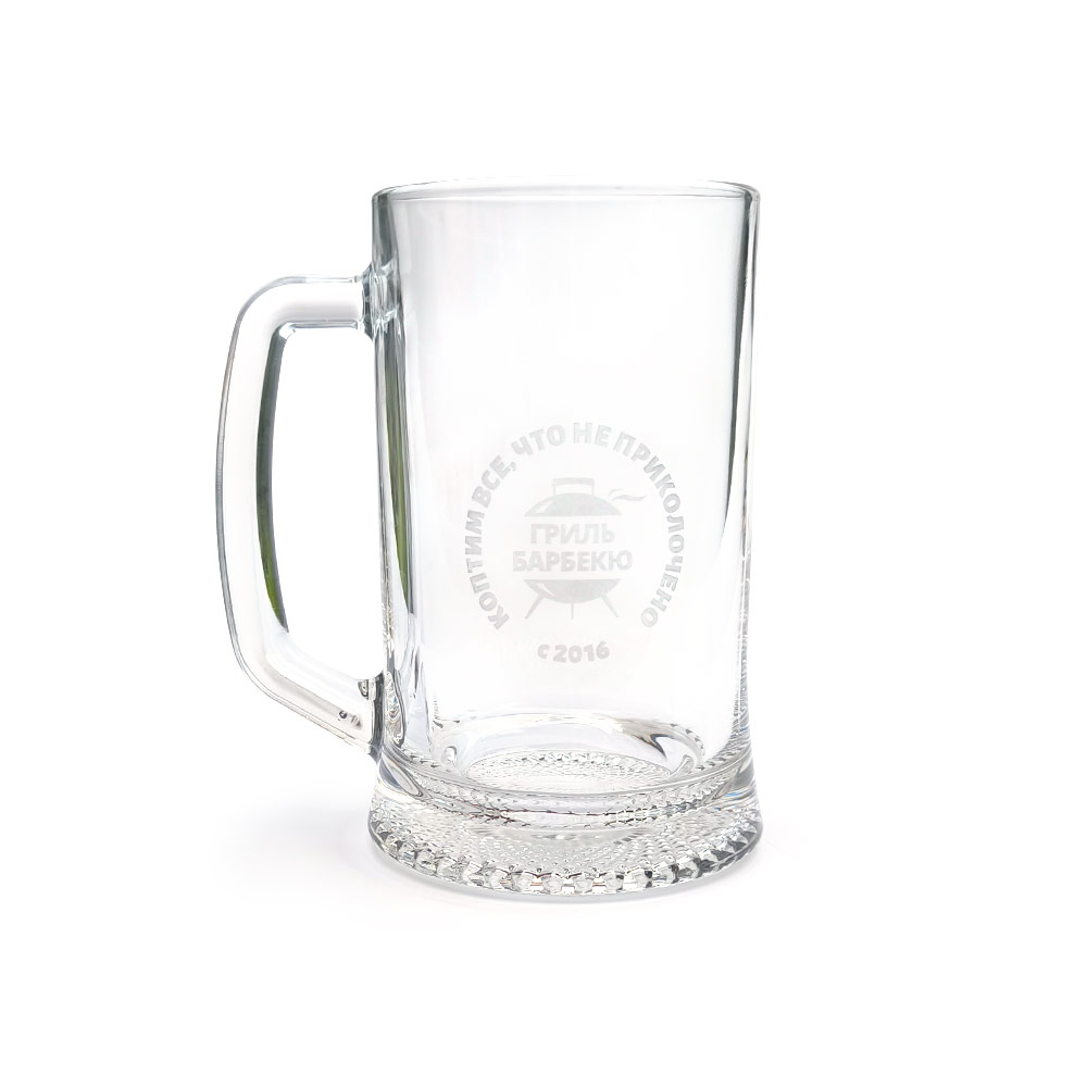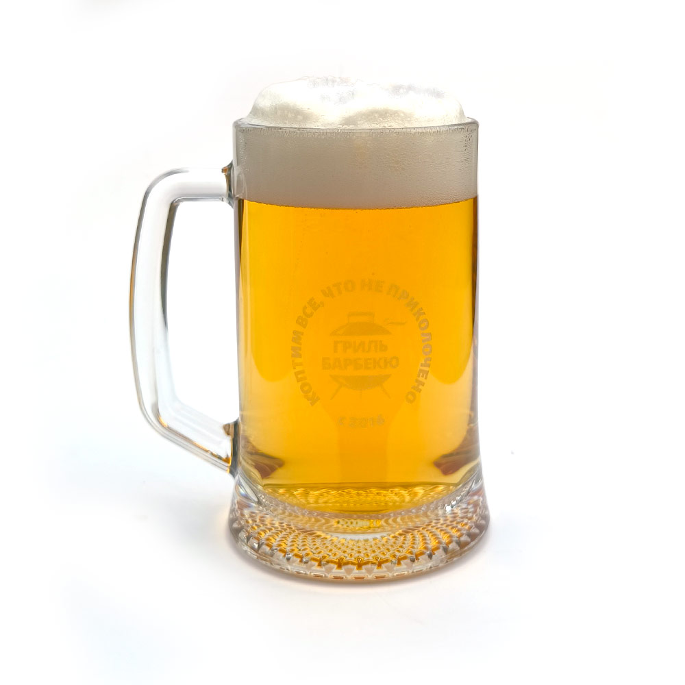 Объёмная пивная кружка с лого «Гриль-Барбекю Клуба» и фирменной фразой.