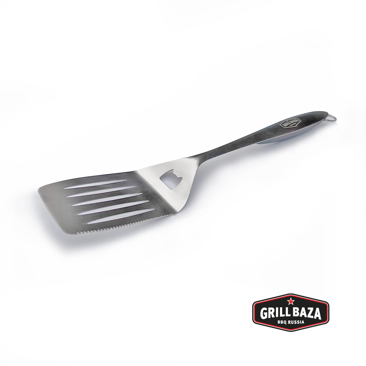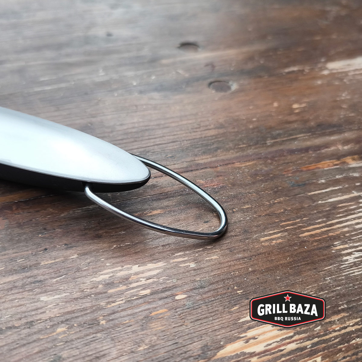 - Имеется металлическая петля, чтобы подвешивать лопатку на крючок гриля — пусть будет под рукой