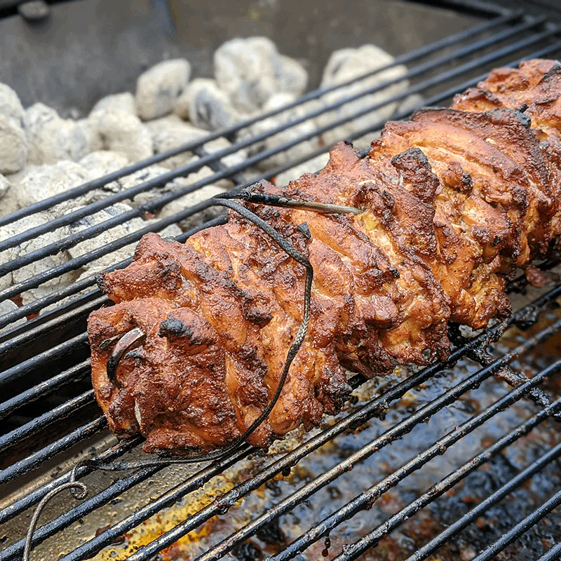 - Подогрев, мелкие продукты и тушение. Поставьте поддон в зону непрямого жара — и пользуйтесь удобной зоной подогрева, запекания или тушения, пока над углями обжаривается другой продукт. А ещё в поддоне удобно готовить мелко нарезанные продукты или, например, креветки.