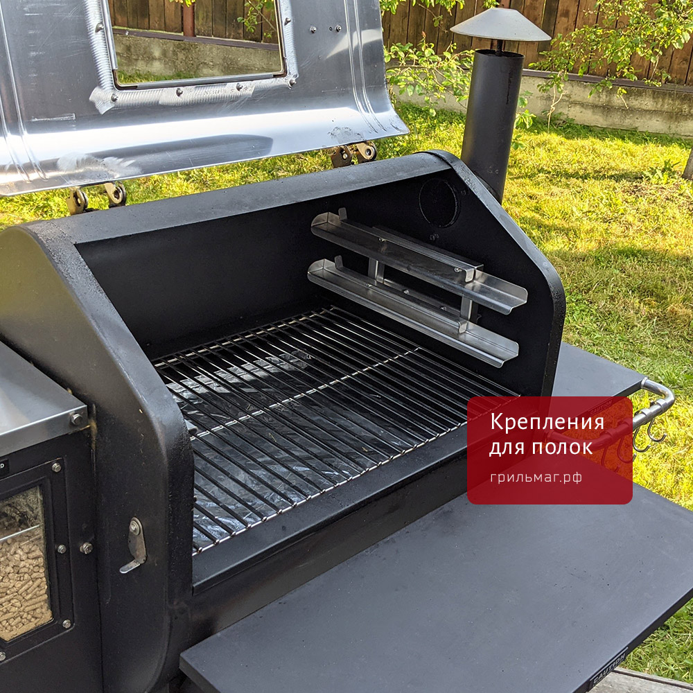 Разработка отечественных умельцев для пеллетников GMG Legde — система креплений и выдвижных полок из нержавеющей стали. Полки создают в гриле дополнительное рабочее пространство, чтобы одновременно готовить в нем почти втрое больше еды.