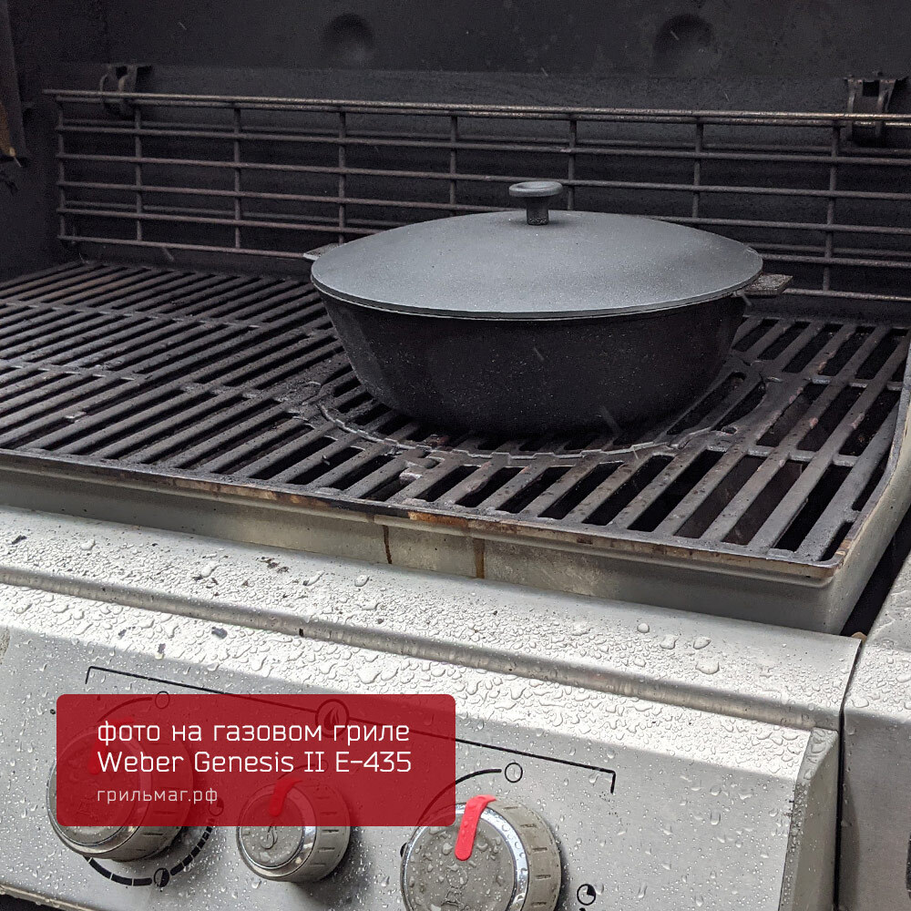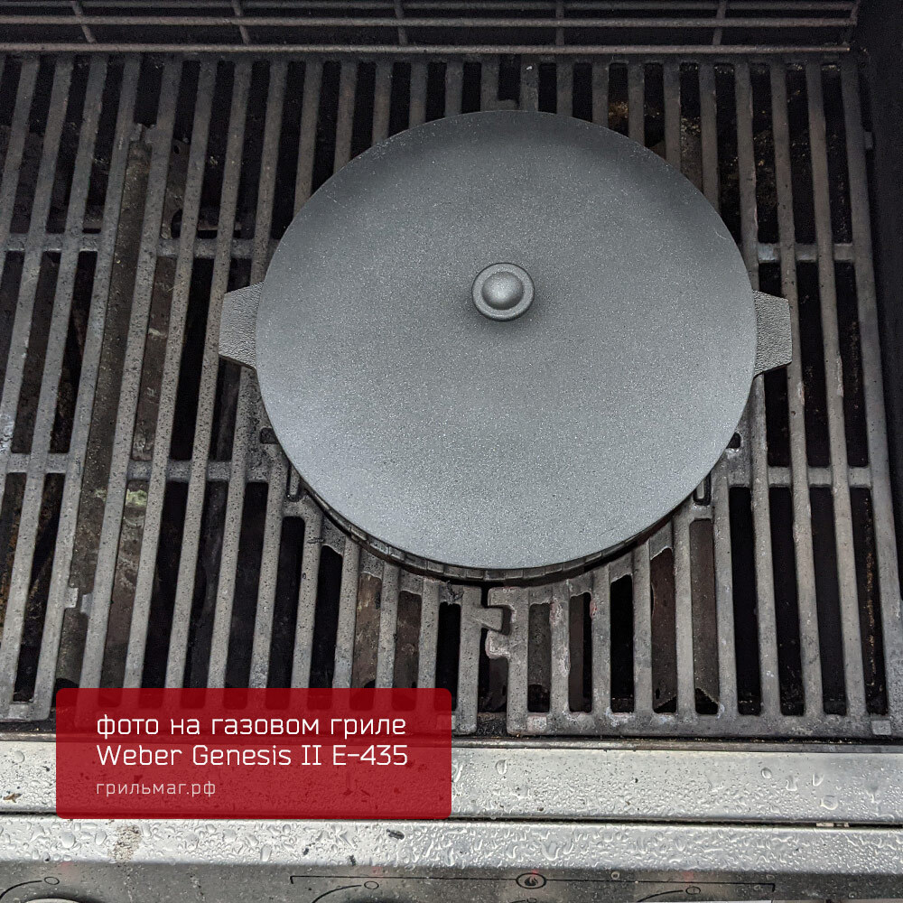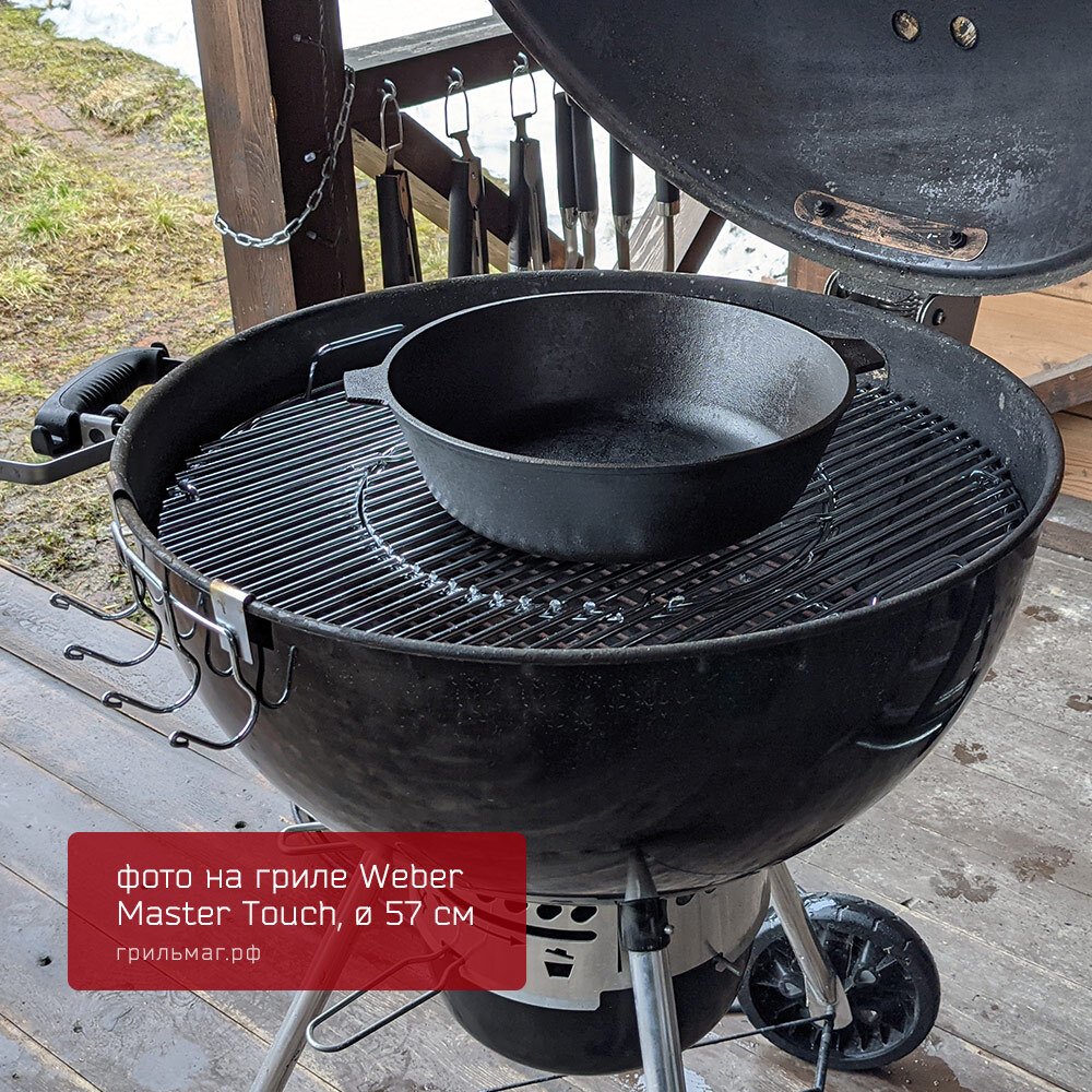 - Размер позволяет разместить сковороду на половине решетки угольного гриля 57 см, оставляя вторую половину свободной для приготовления других блюд.