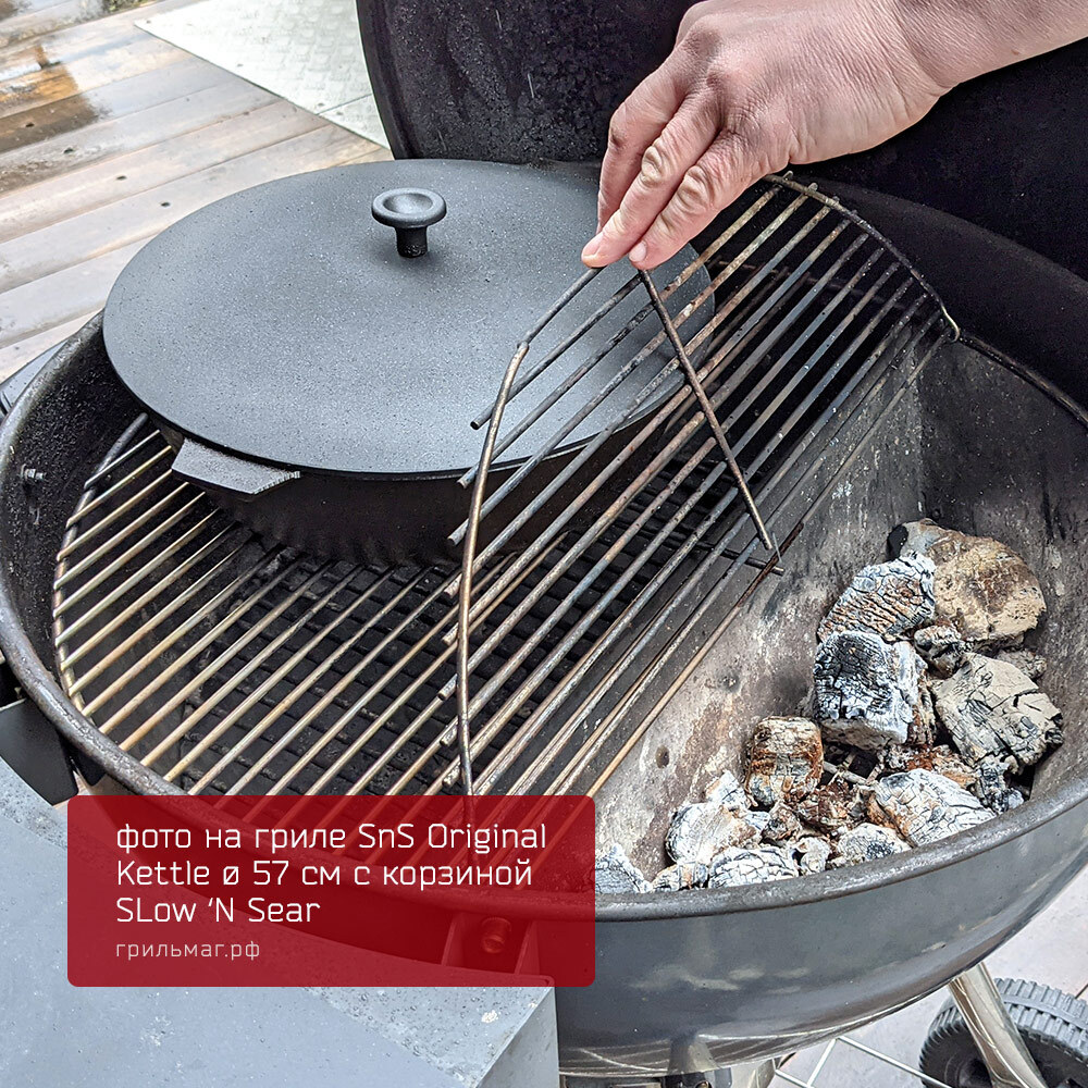 - Эта жаровня идеально подходит для приготовления с корзиной Slow ‘N Sear.