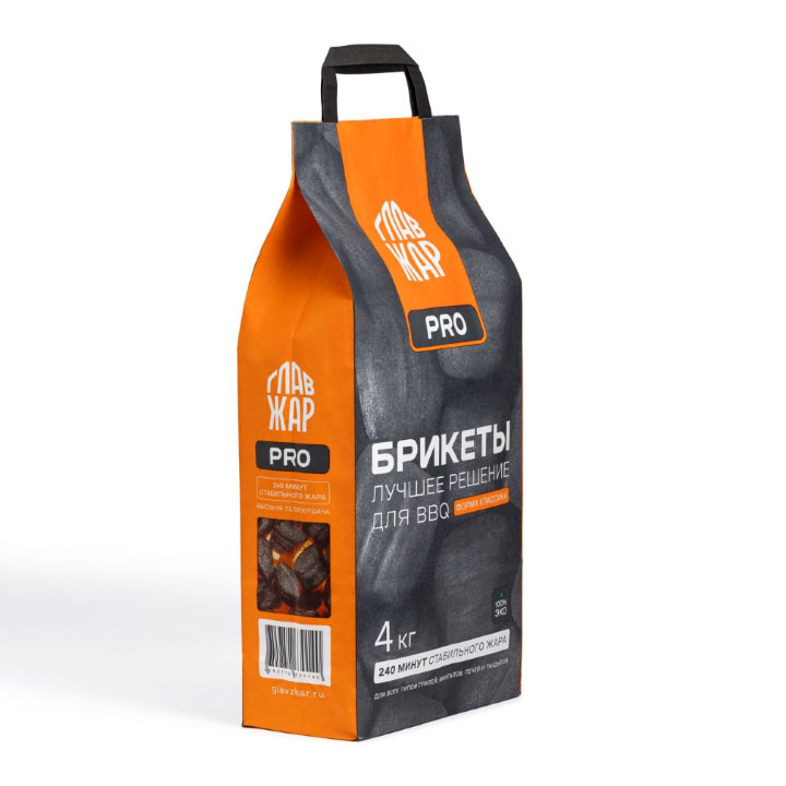 4 килограмма отличных угольных брикетов «ГлавЖар» в удобном пакете.