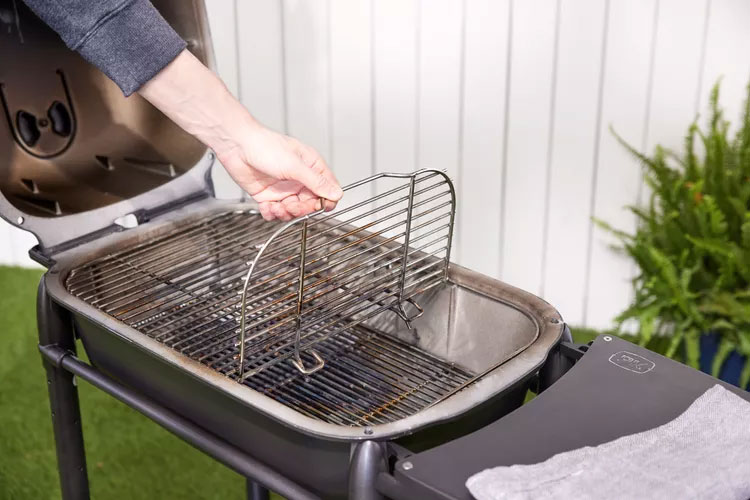 Форма гриля идеальна для того, чтобы готовить крупные мясные блюда или сразу много еды на большую компанию. Возможны и копчение, и жарка, и обжарка. Также есть дополнительная решетка для разогрева. В тележке много места для аксессуаров, и ее удобно перемещать. Минусы обнаружены следующие: при копчении жар в гриле несколько раз поднимался выше 118 °C, а еще у гриля несъемный угольный лоток, поэтому при очистке уголь приходится оттуда выгребать.