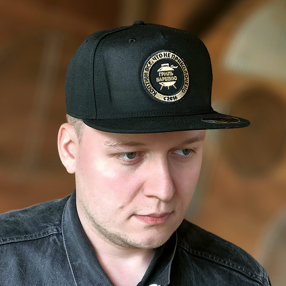 Кепка с золотым шевроном «Коптим всё, что не приколочено» и лого «Гриль-Барбекю Клуба». Прямой козырёк, пластиковая застёжка, универсальный размер.