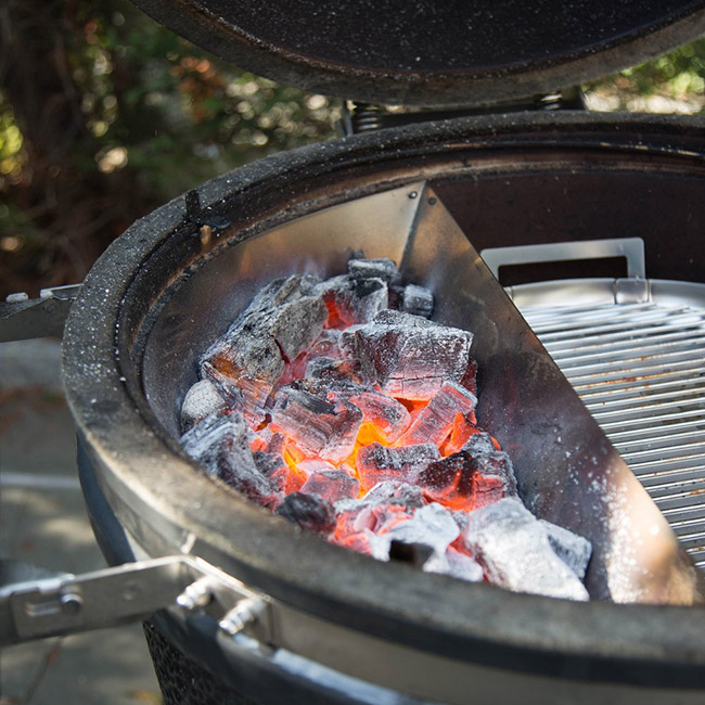 - Или высыпьте в корзину стартер полностью разожженных брикетов, чтобы создать зону сильного жара (выше 200 °С), идеальную, чтобы поджарить золотистую курочку или испечь хрустящую пиццу!