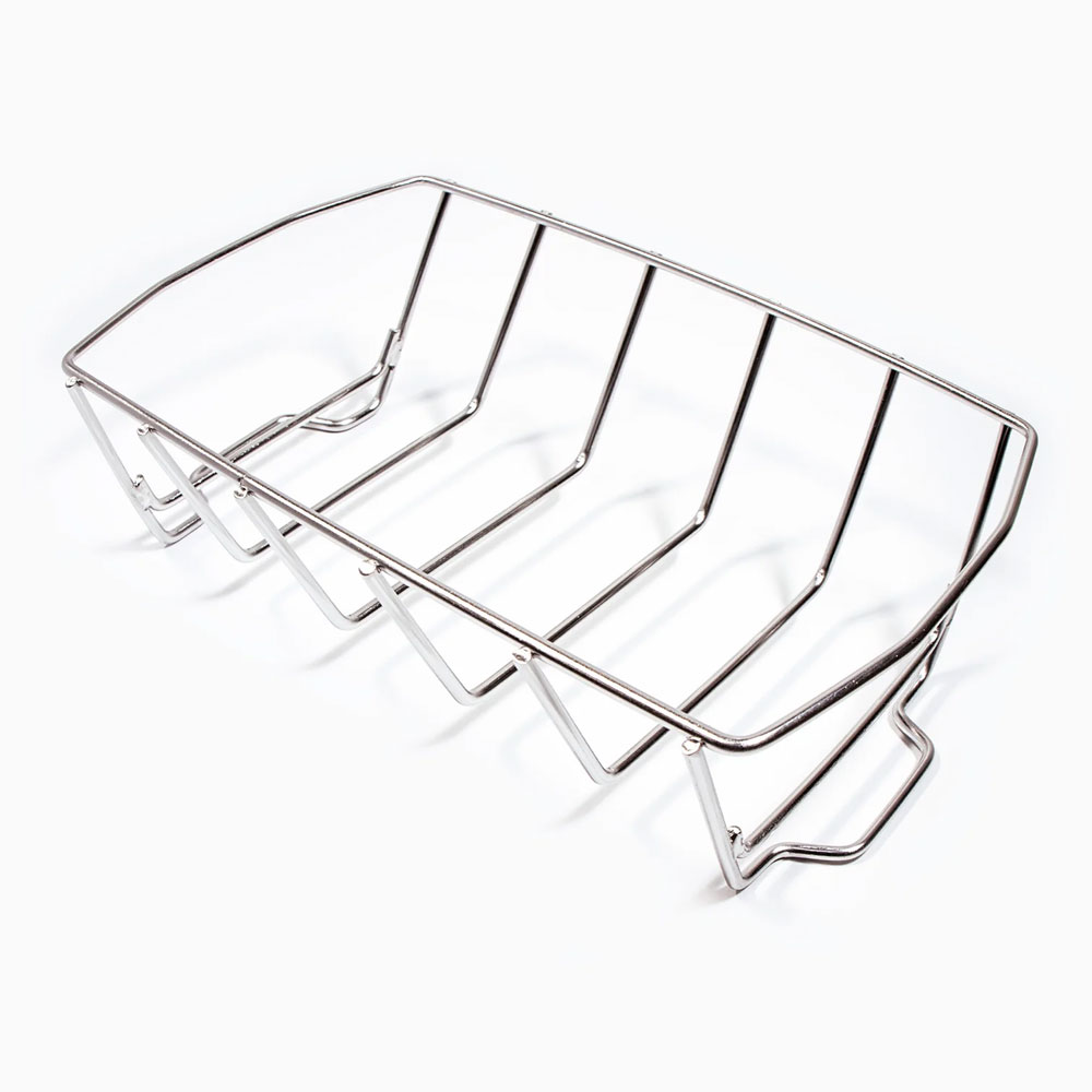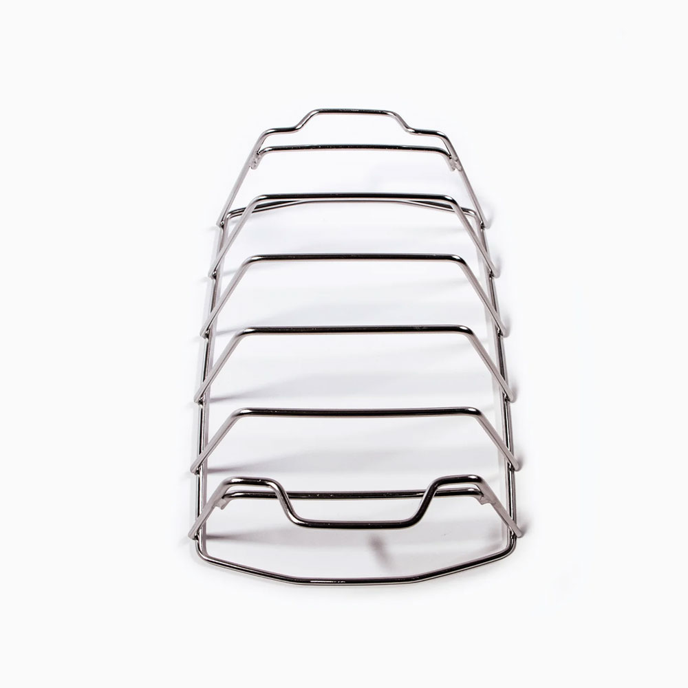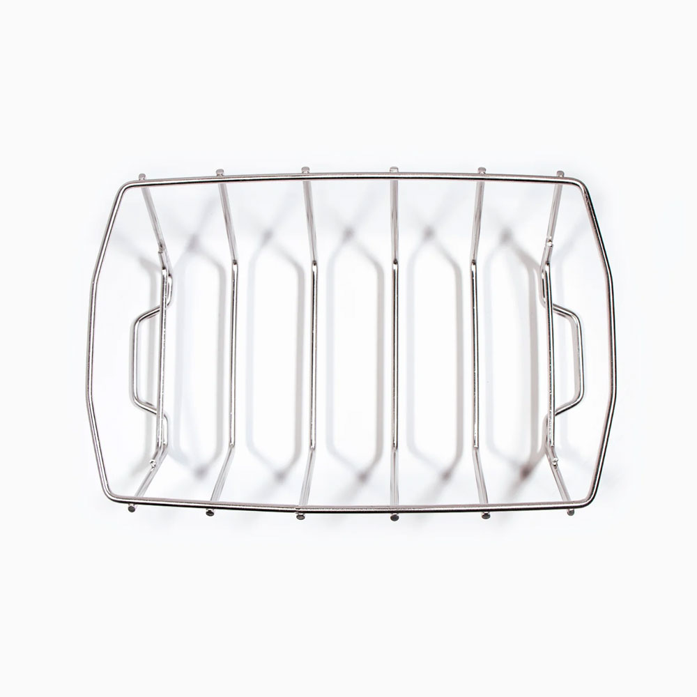 - Конструкция 2 в 1: подставка для рёбрышек и решётка для запекания крупных мясных блюд. Можно разместить 5 пластин рёбрышек, а можно приподнять над решёткой гриля ростбиф или курицу целиком.