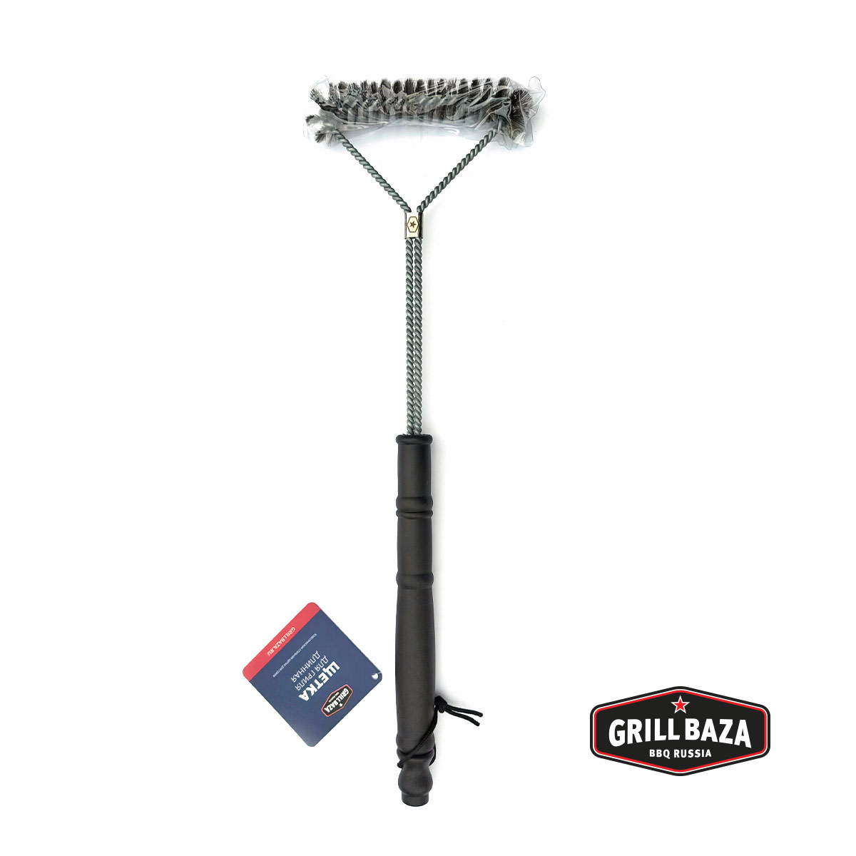 - Щётка имеет стальные щетинки, прочную пластиковую ручку и петлю для подвешивания. Можно расположить её, например, на крючке на ручке гриля