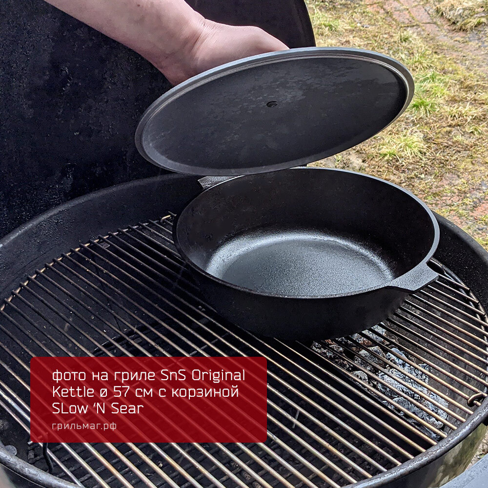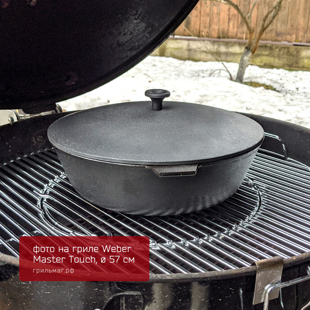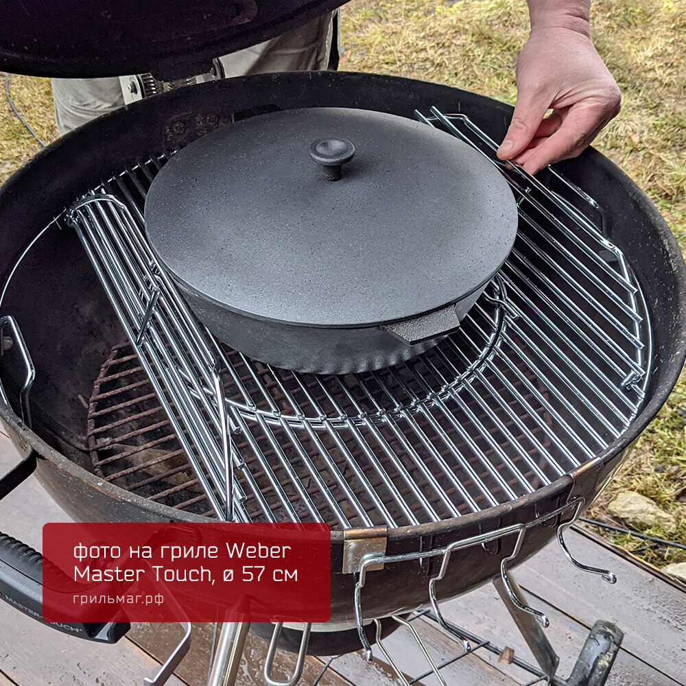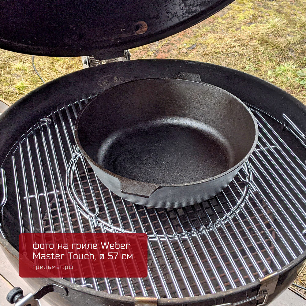 - Размер позволяет разместить сковороду на половине решетки угольного гриля 57 см, оставляя вторую половину свободной для приготовления других блюд.