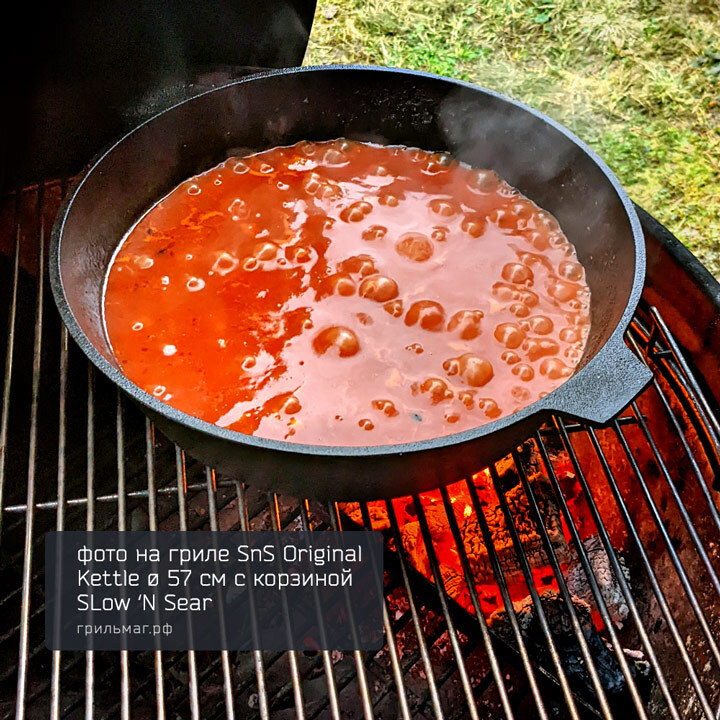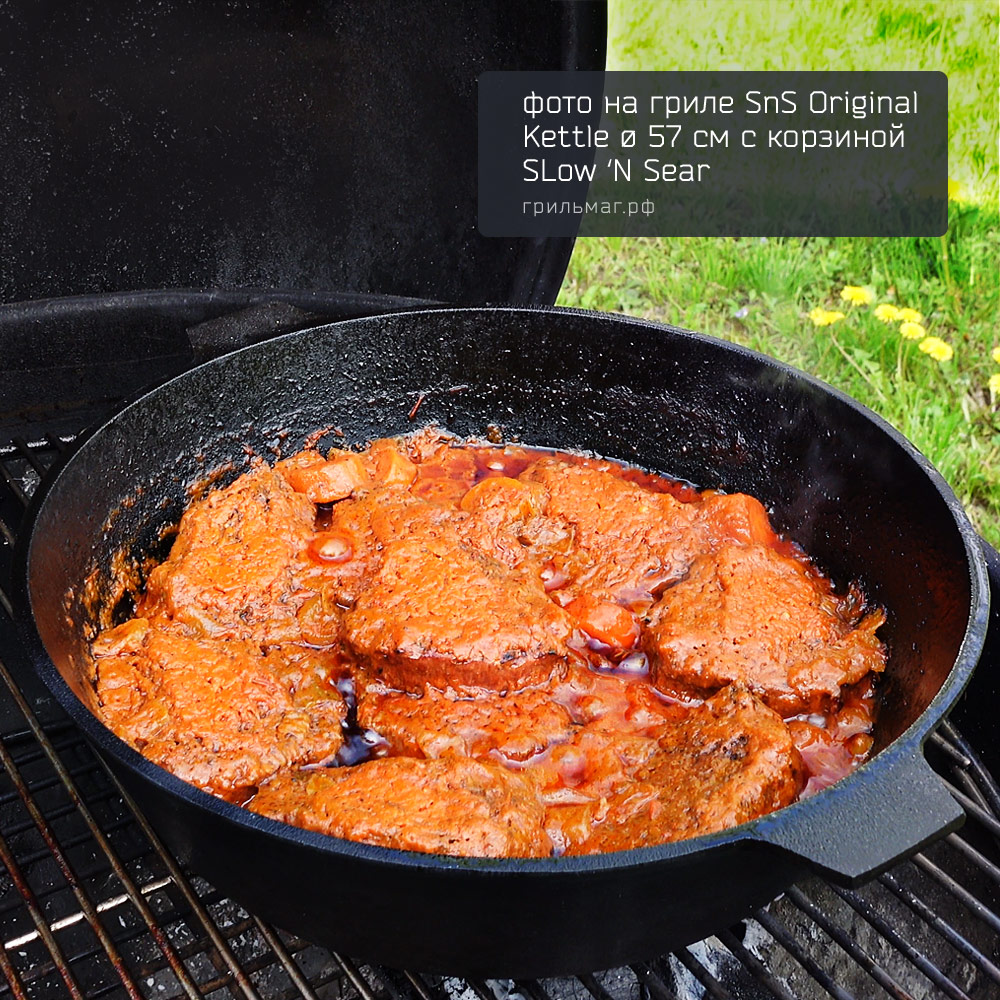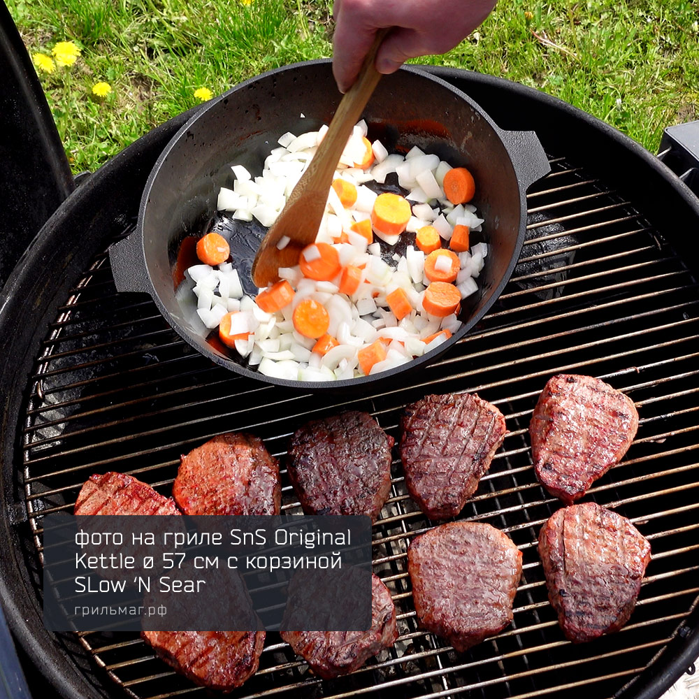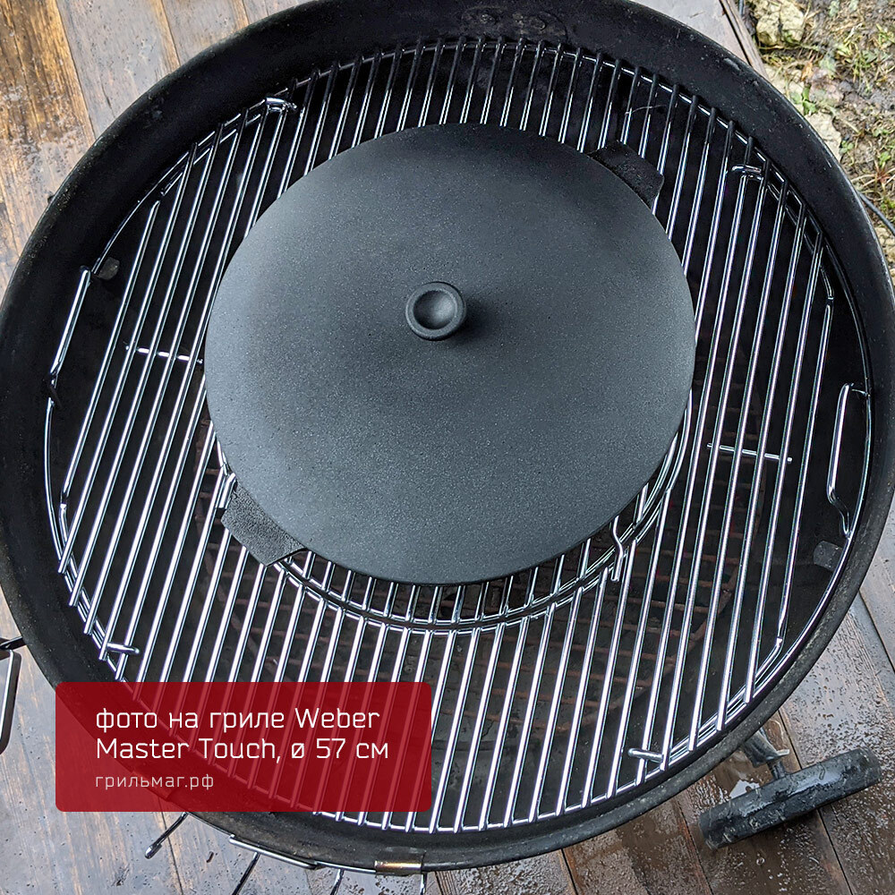 - Размер позволяет разместить сковороду на половине решетки угольного гриля 57 см, оставляя вторую половину свободной для приготовления других блюд.
