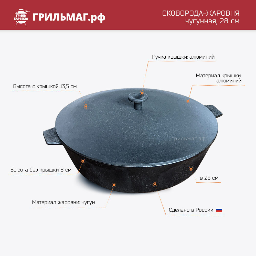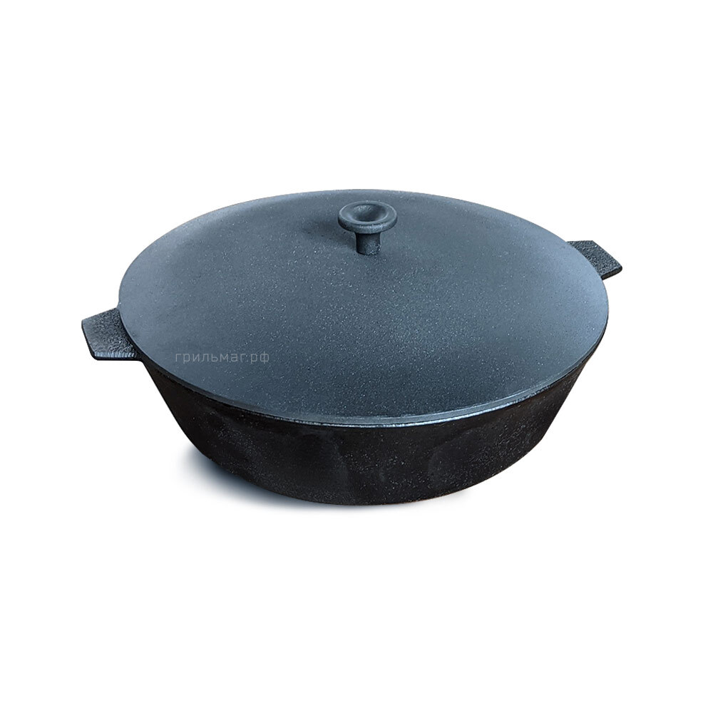 Сковорода из литого чугуна прекрасно подходит для приготовления на гриле и мангале, даже на кухонной плите или в духовке. Объема этой жаровни достаточно, чтобы приготовить угощение сразу на 4-5 персон. Она устойчива, равномерно прогревается и долго удерживает тепло, создавая эффект томления. Блюда в ней получаются особенно сочными, ароматными и румяными.