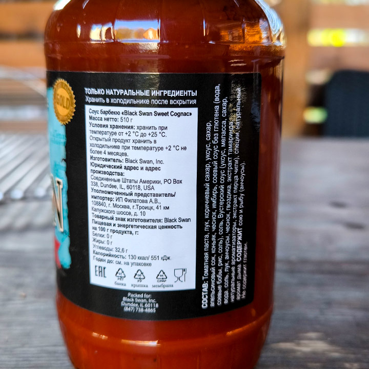 Состав: томатная паста, лук, коричневый сахар, уксус, апельсиновый сок, ароматизатор «коньяк», чеснок, имбирь, соевый соус без глютена (вода, соевые бобы, рис, соль), соль, Вустерский соус (уксус, меласса, сахар, вода, соль, лук, анчоусы, чеснок, гвоздика, экстракт тамаринда, натуральные ароматизаторы, экстракт перца чили), специи, натуральный аромат дыма.
