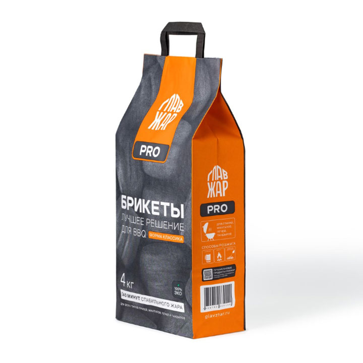 4 килограмма отличных угольных брикетов «ГлавЖар» в удобном пакете.